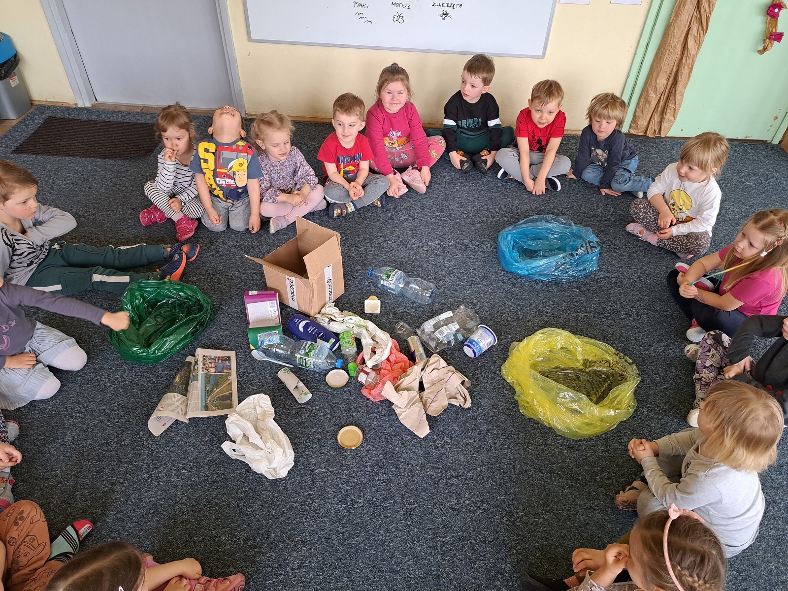 W przedszkolu odbyły się zajęcia, których głównym celem było zachęcanie dzieci do segregowania śmieci oraz dbania o otaczający świat. Dzieci rozpoznawały materiały z których wykonane były odpady,a następnie segregowały je do odpowiednich worków (makulatura, szkło, plastik). Pszczółki świetnie współpracowały i z wielkim zaangażowaniem oraz radością uczestniczyły w zabawach ekologicznych. Na koniec zajęć odbyły „sensoryczny spacer” …