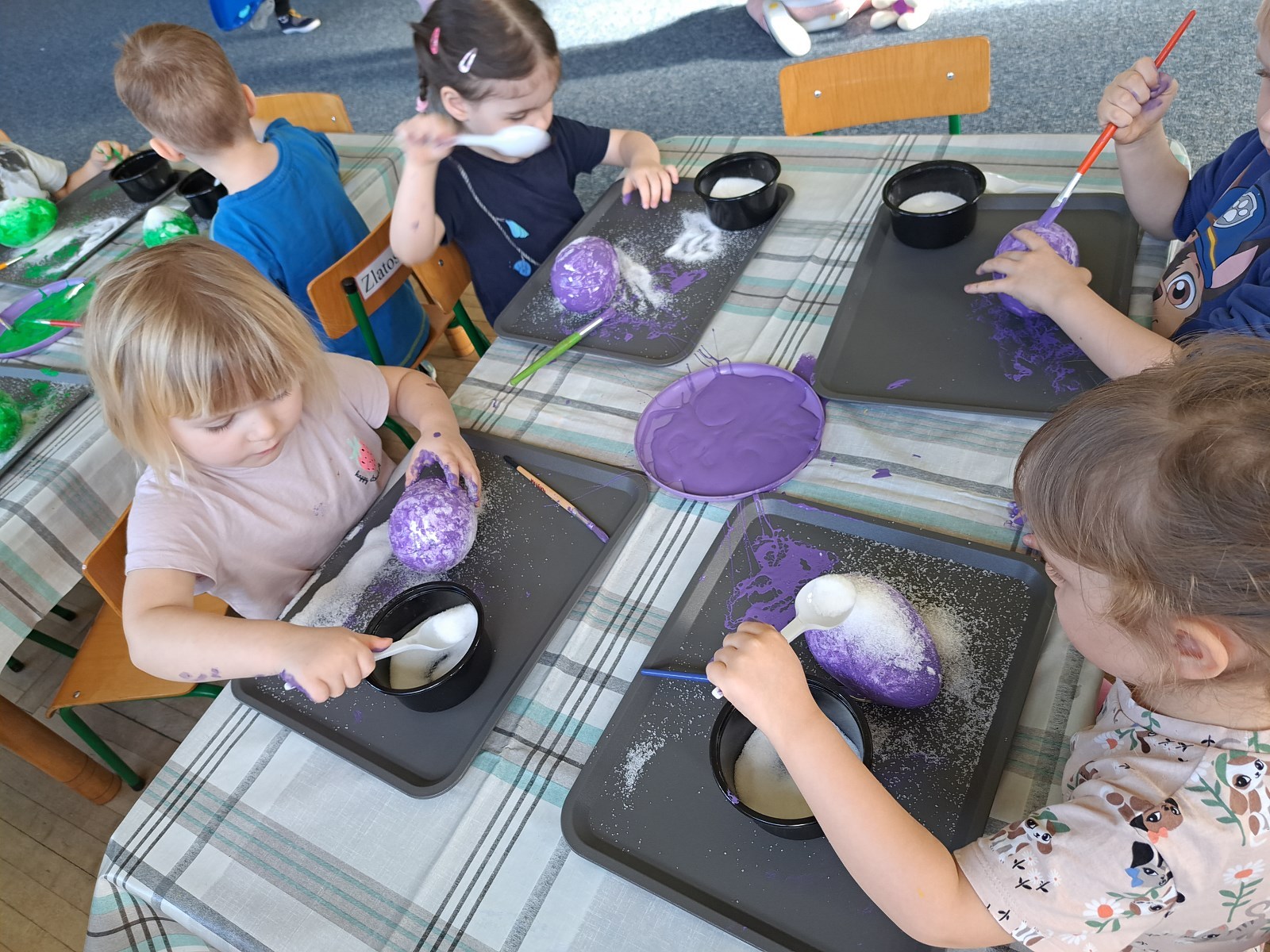 W dniu dzisiejszym maluszki wykonały pisanki. Jaja zostały pomalowane farbami i obsypane cukrem. Mamy nadzieję, że będą stanowiły piękna dekoracje na świątecznym stole.