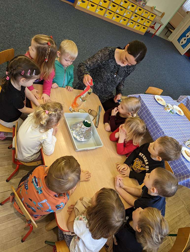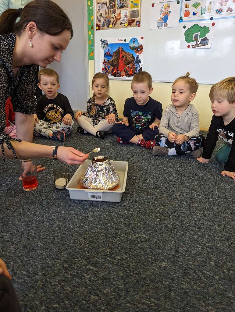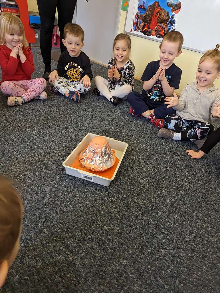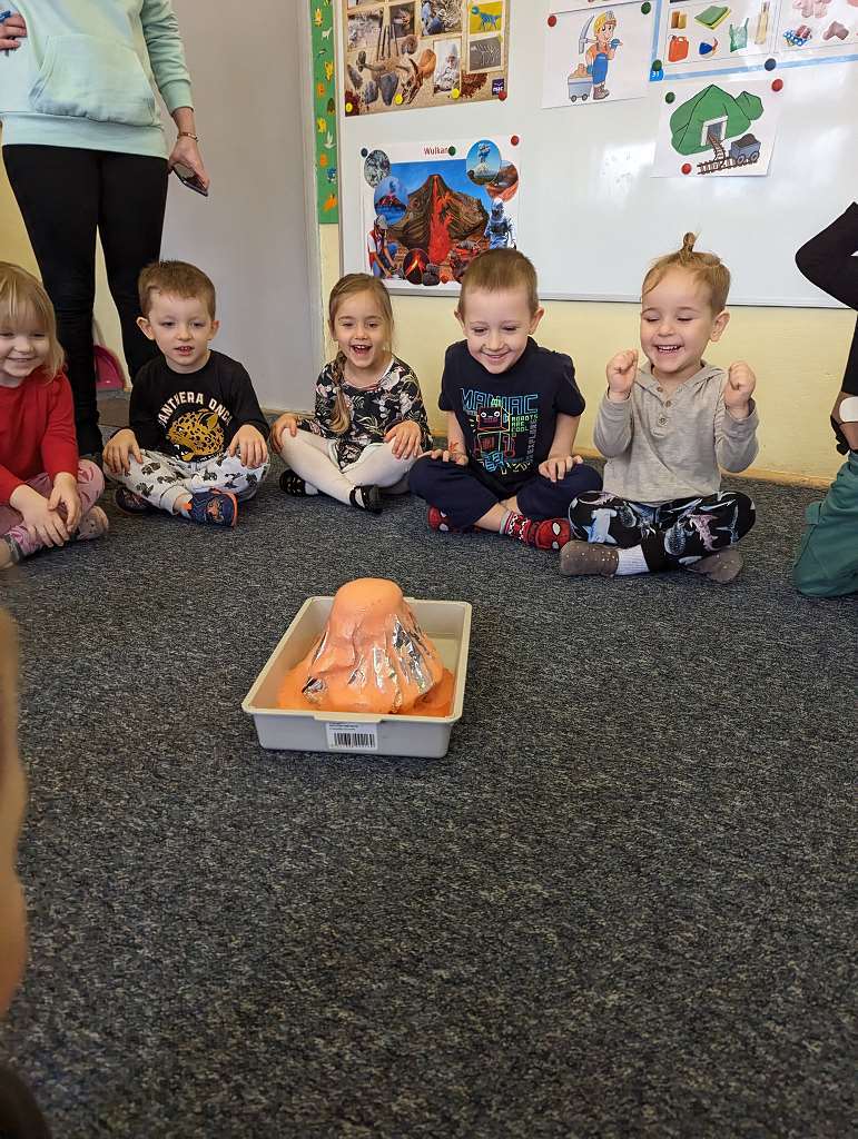 Zajęcia badawcze 26 lutego 2023 Dzieci z grupy I podczas zajęć dydaktycznych dowiedziały się co się znajduję we wnętrzu Ziemi i czym jest wulkan, a także uczestniczyły w zajęciach badawczych, gdzie miały okazję obejrzeć erupcję „Wulkanu z piany”.