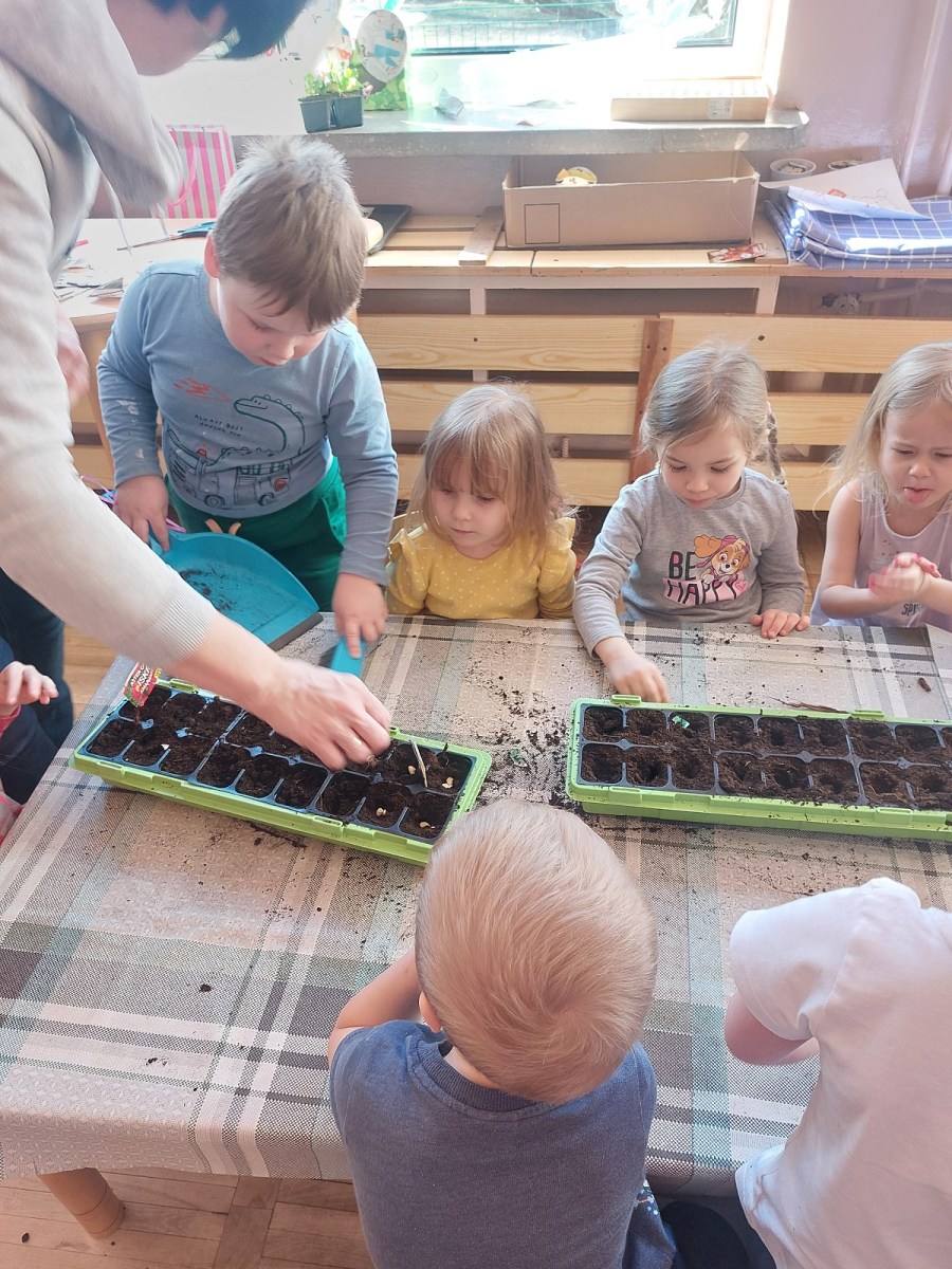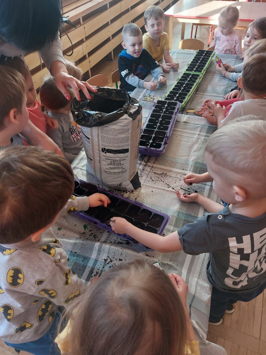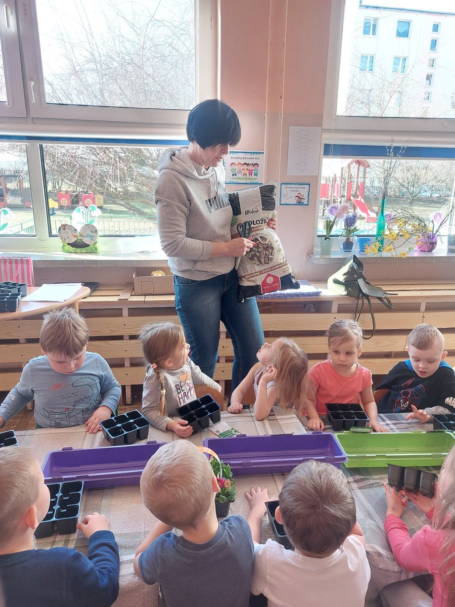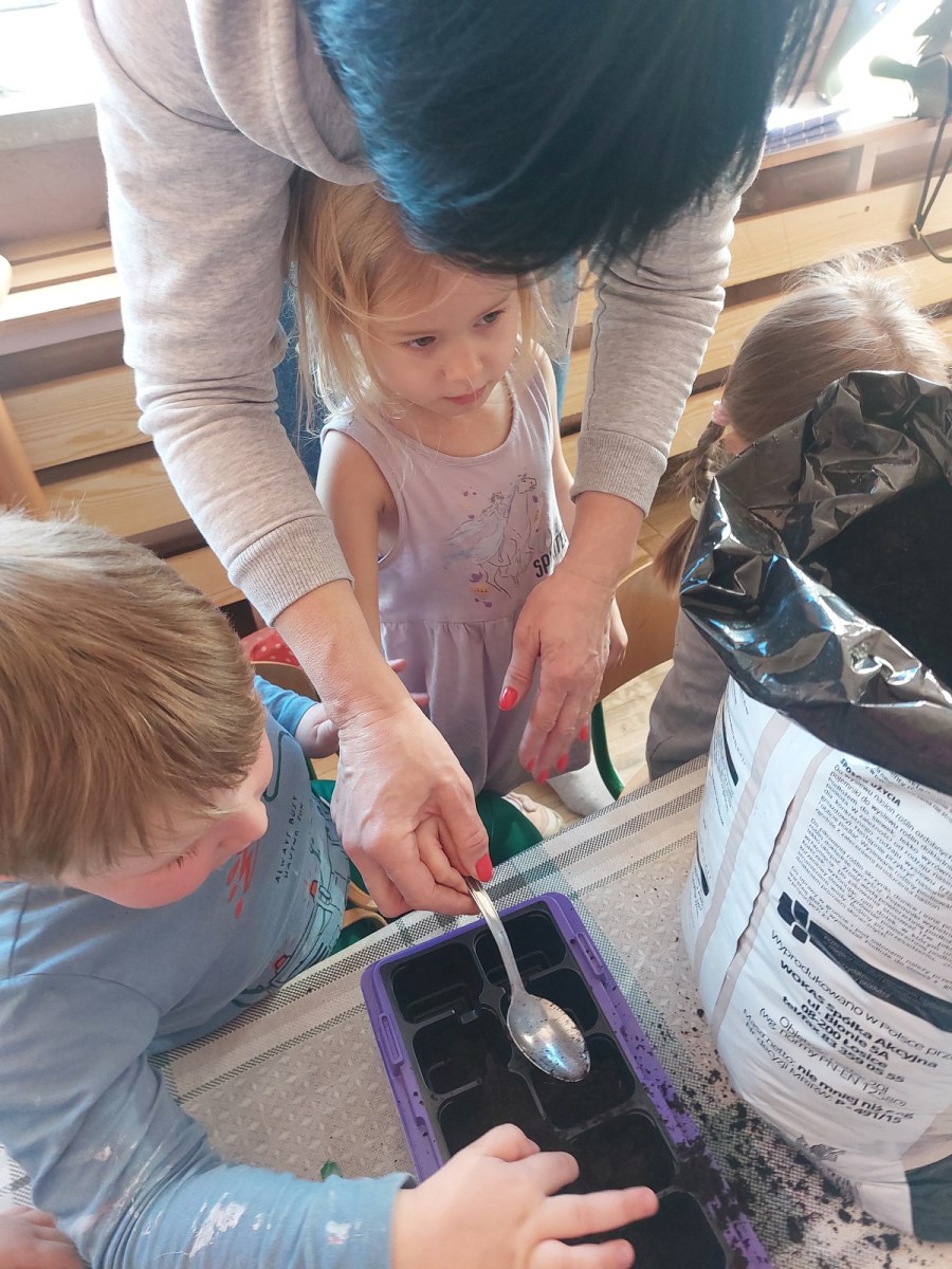 Sadzenie kwiatów w skrzynkach rozsadnych – wizyta mamy Nataniela.