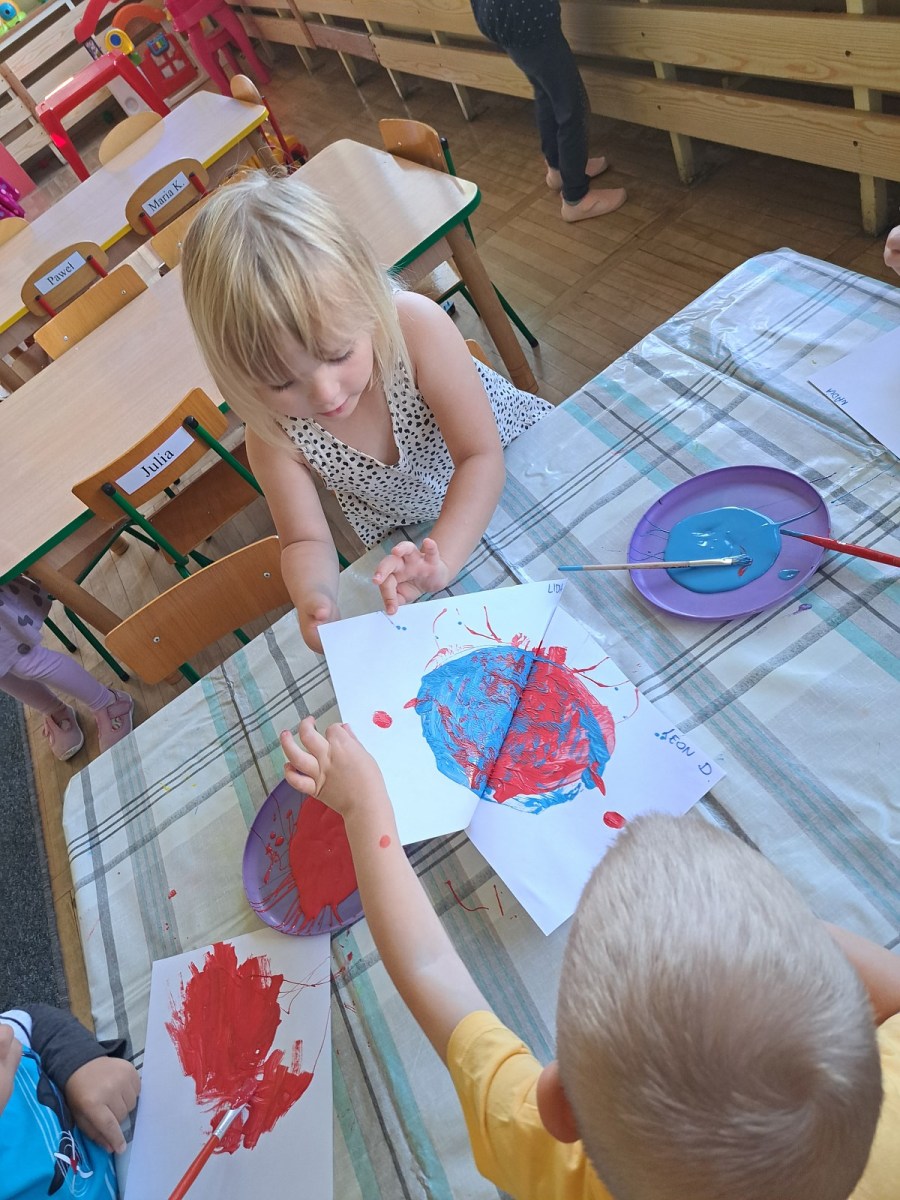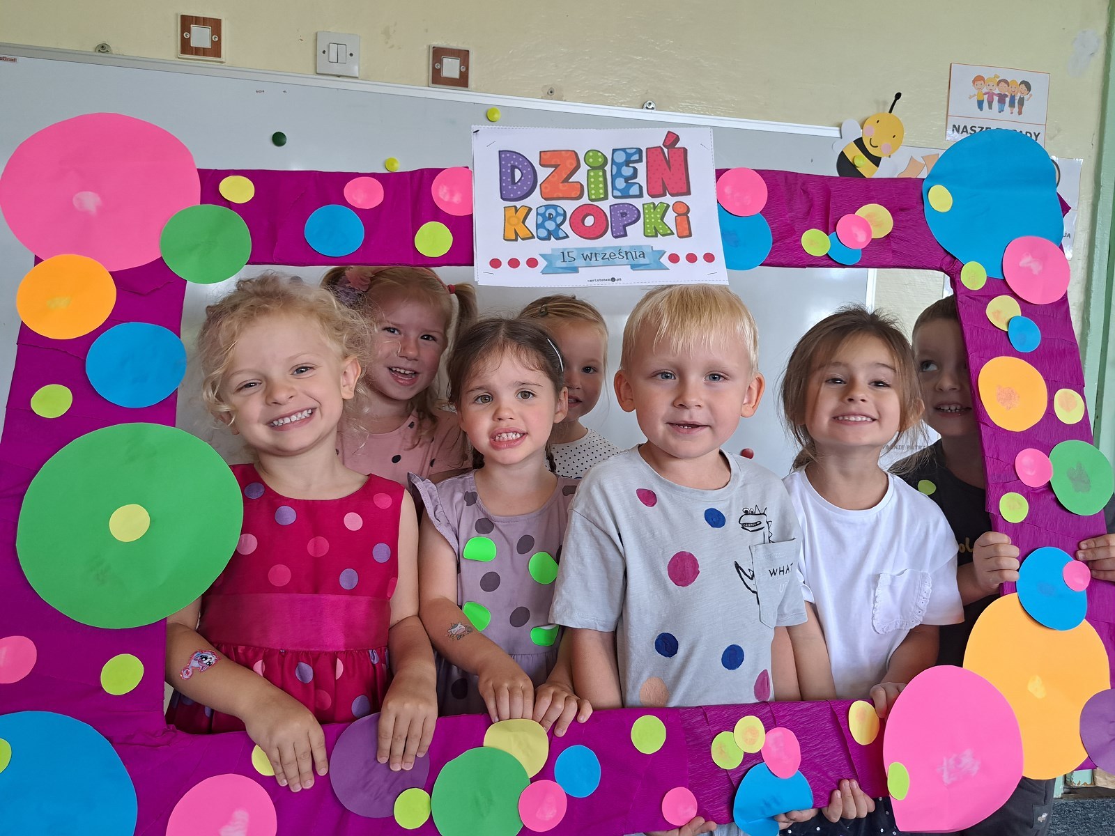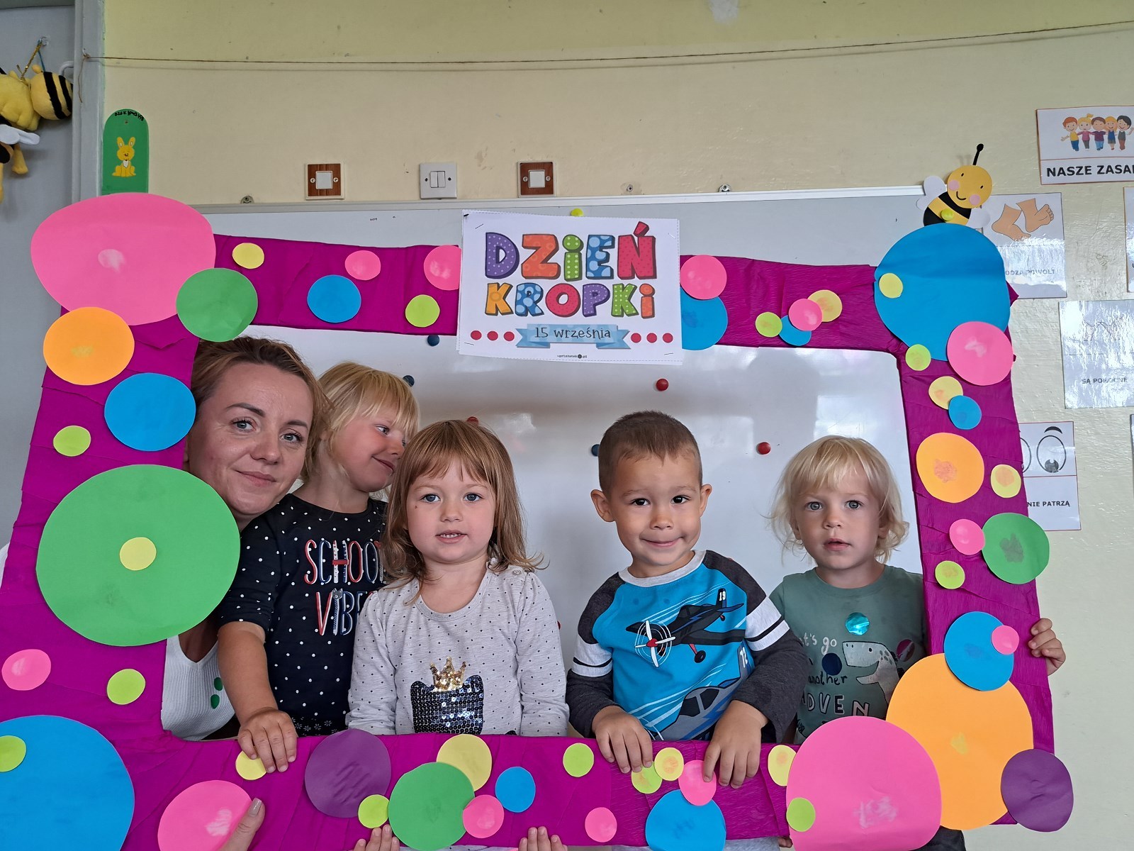 Międzynarodowy Dzień Kropki 24 września 2023 15 września obchodziliśmy z Pszczółkami Dzień Kropki. Dzieci zapoznały się z historyjka o małej Vashti. Ćwiczyły skupienie uwagi oraz motorykę małą podając sobie papierową kropkę klamerką oraz wykonały piękne prace plastyczne.