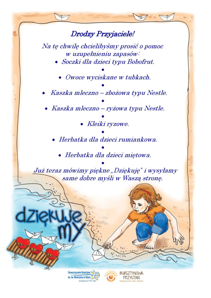 Nasze przedszkole organizuje zbiórkę dla Gdyńskiego Hospicjum „Bursztynowa Przystań”. Serdecznie zachęcamy do przyłączenia się do akcji. Dary można umieszczać w koszu znajdującym się ma korytarzu przedszkola.