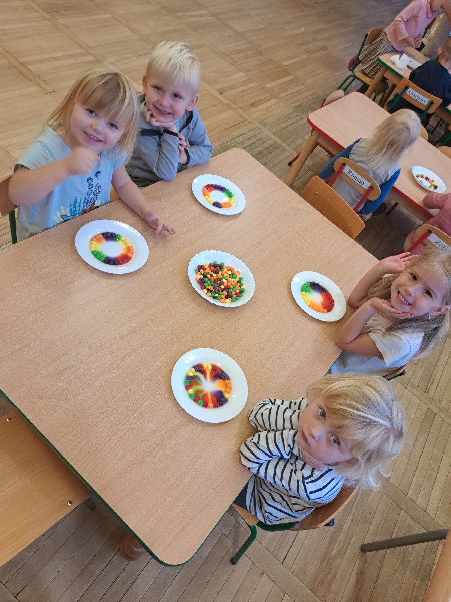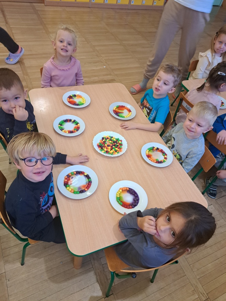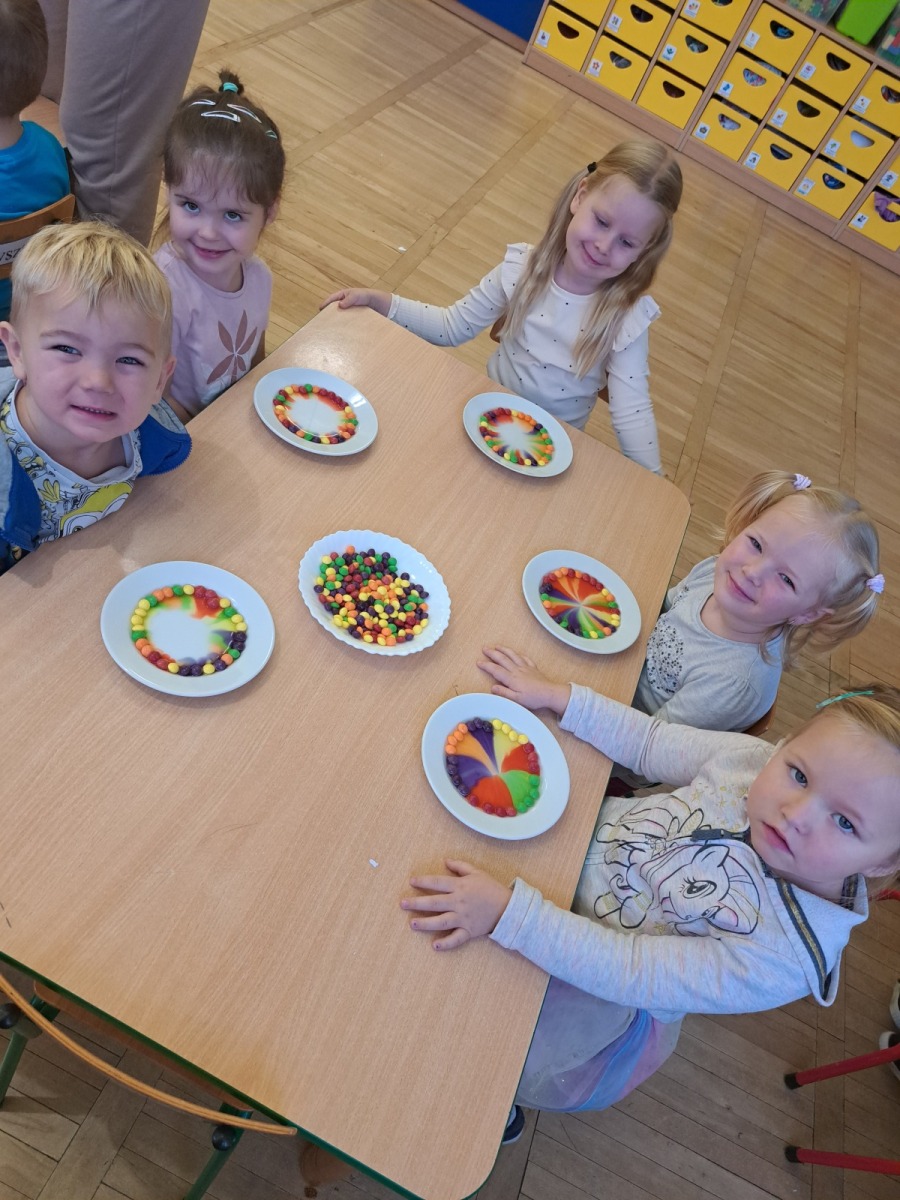 Tęczowy eksperyment 2 listopada 2023 W dniu dzisiejszym pszczółki wykonały kolorowa tęczę z cukierków.