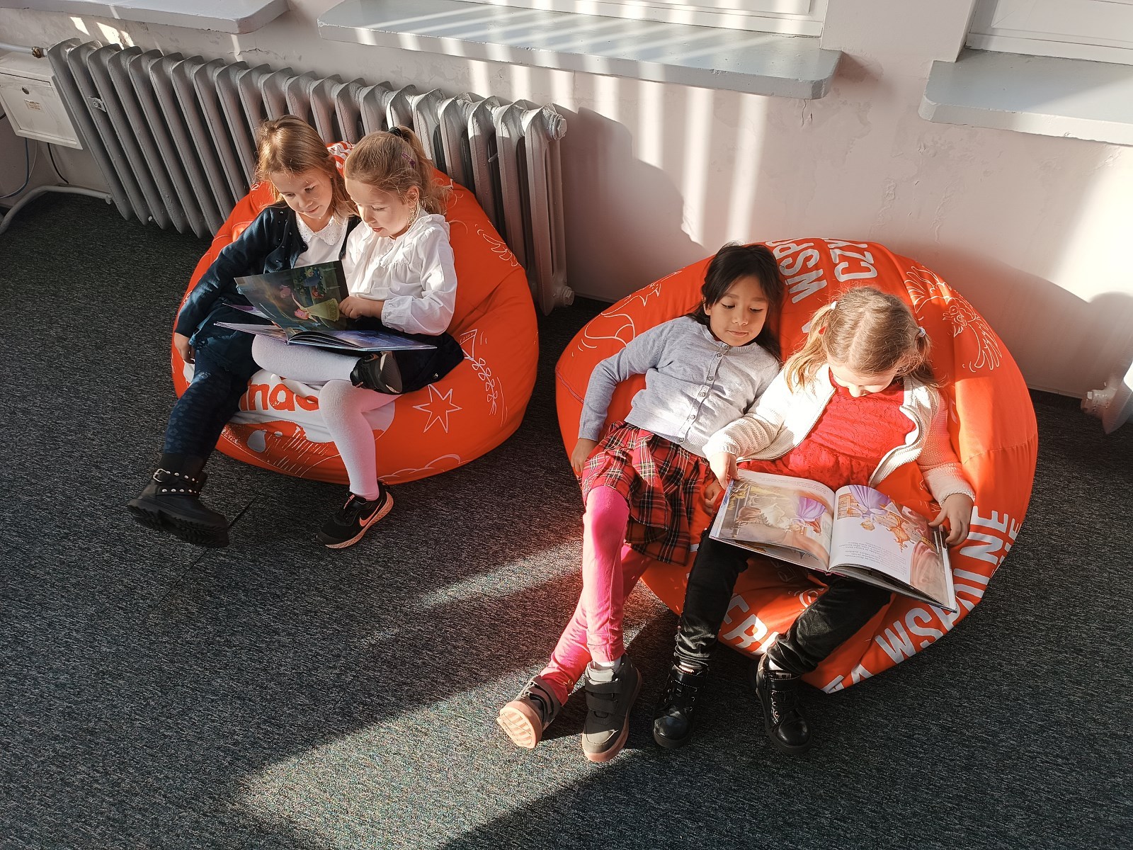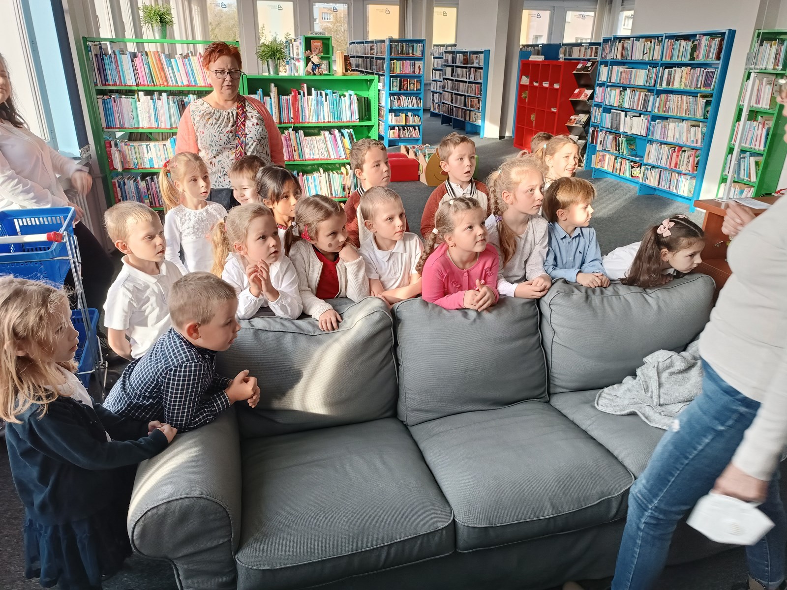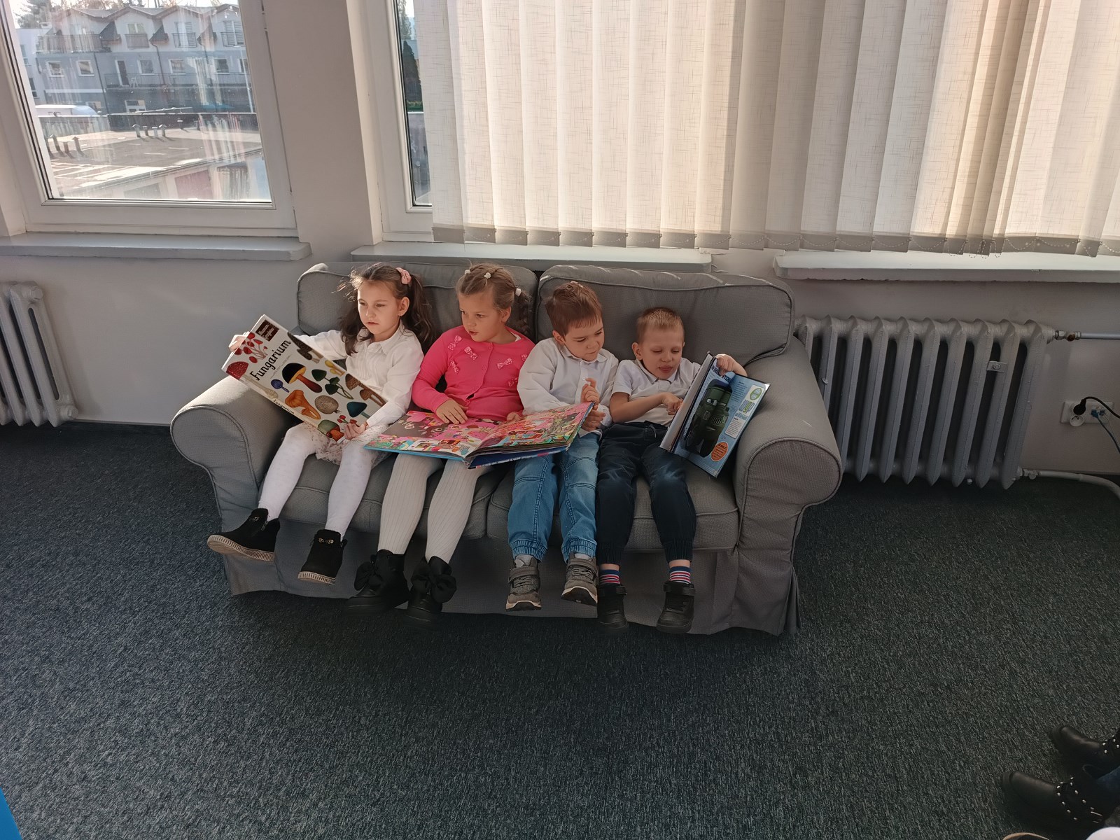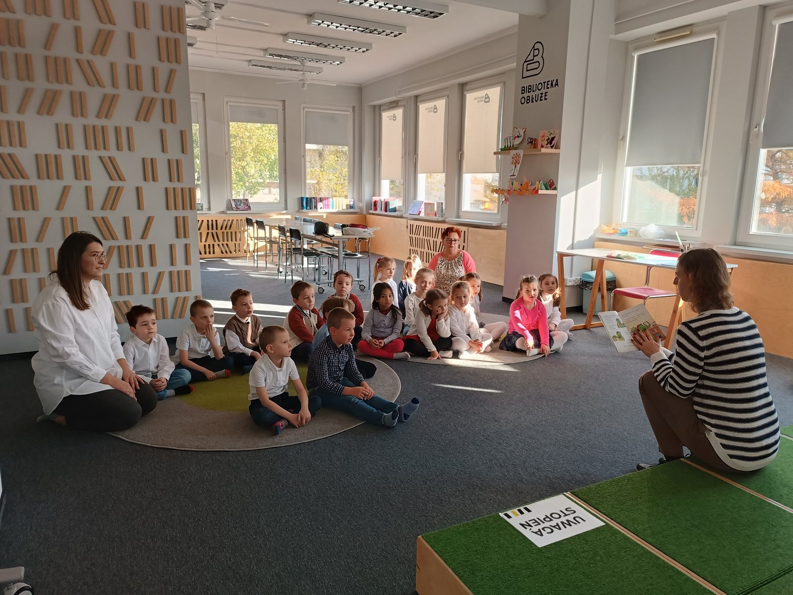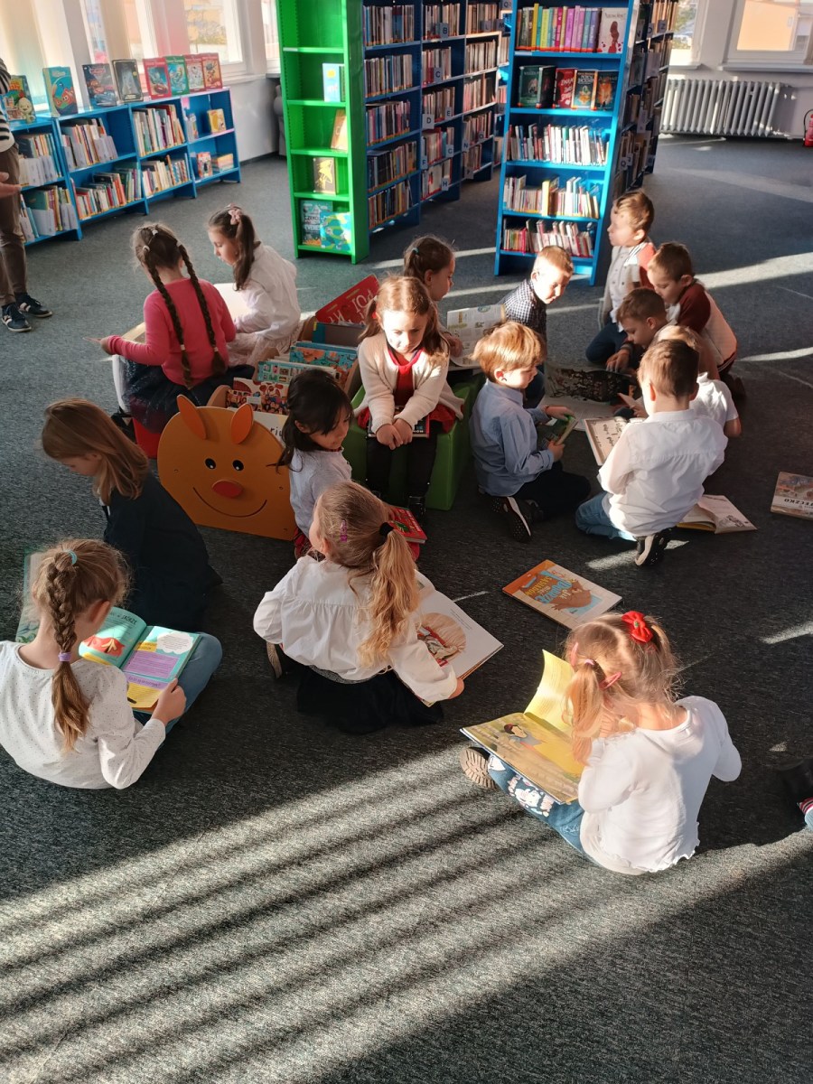Dnia 10.11.2023r. (piątek) dzieci z grupy „Rybki” odwiedziły Bibliotekę Obłuże. Przedszkolaki poznały pomieszczenia znajdujące się w budynku biblioteki. Pani bibliotekarka przeczytała dzieciom książkę pt. „Franklin i książka z biblioteki”, pokazała, gdzie znajduje się przeznaczony specjalnie dla nich regał z książkami. Następnie zaprezentowała i dała do obejrzenia dzieciom książeczki z działu dziecięcego. „Rybki” zapoznały się też z pracą bibliotekarza. Dla wielu przedszkolaków, była to pierwsza wizyta w „domu książek”, ale na pewno nie ostatnia.
