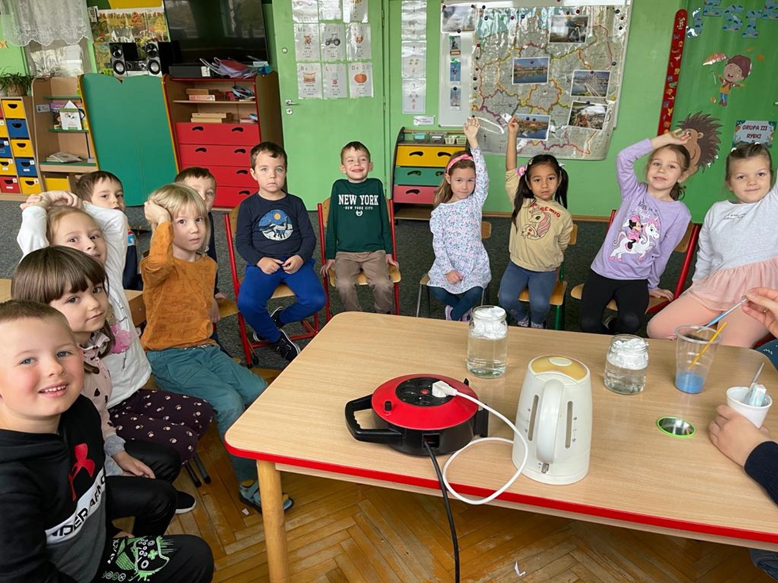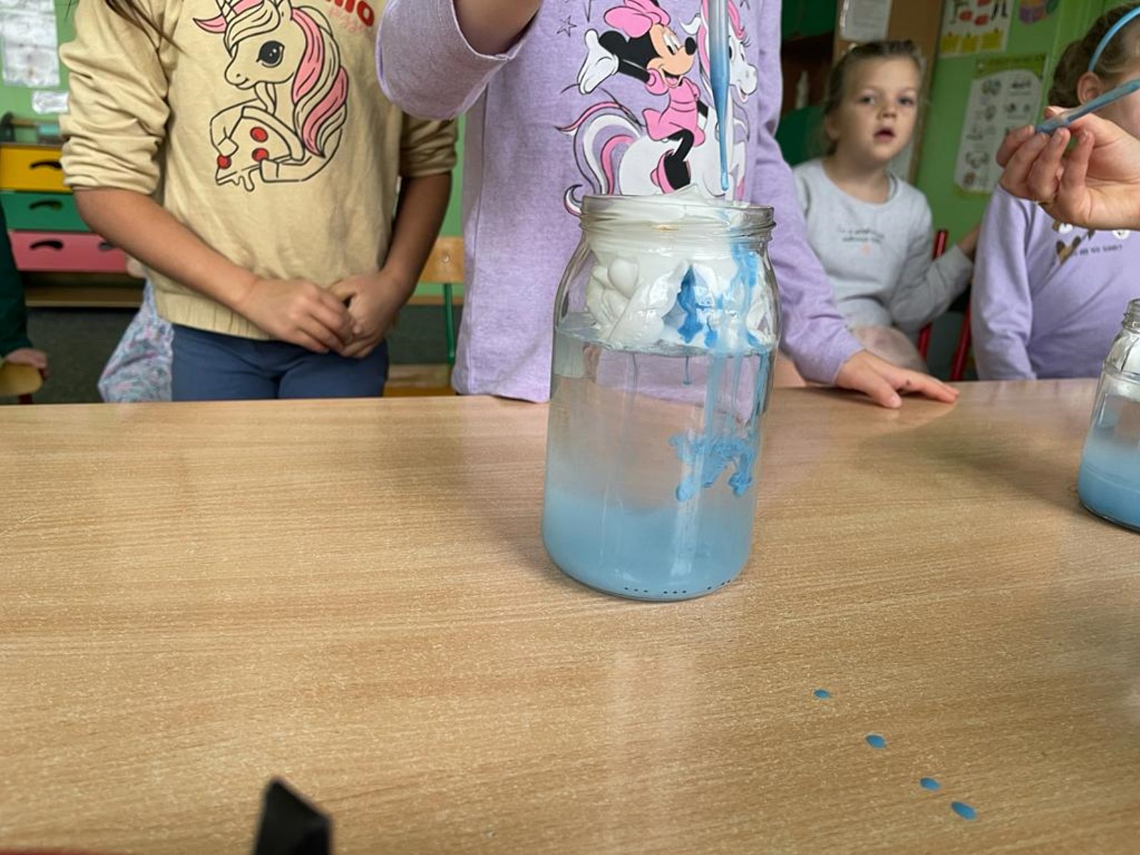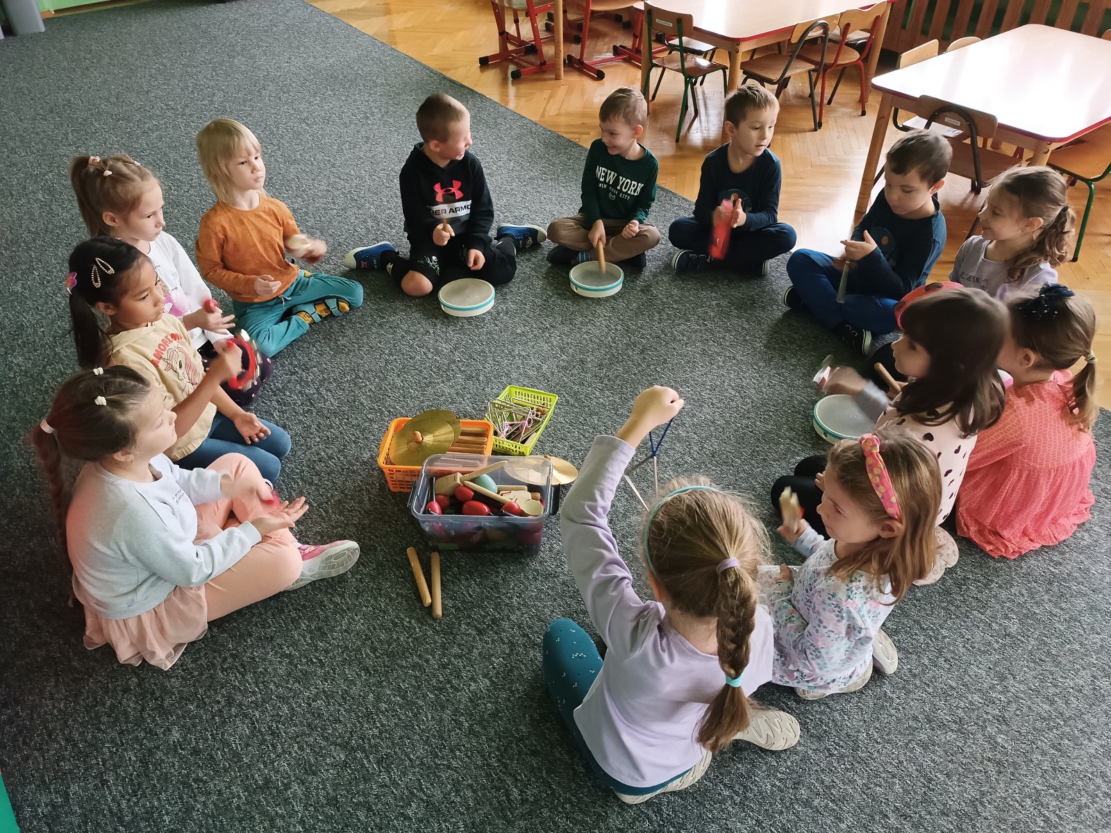 Dnia 14.11.2023r. dzieci z grupy „Rybki”, aby odczarować deszczową pogodę brały udział w zajęciach muzycznych podczas, których poznały nazwy instrumentów oraz wygrywały na nich różne rytmy. W drugiej części zajęć dzieci wykonały eksperymenty, dzięki którym dowiedziały się jak powstaje deszcz.