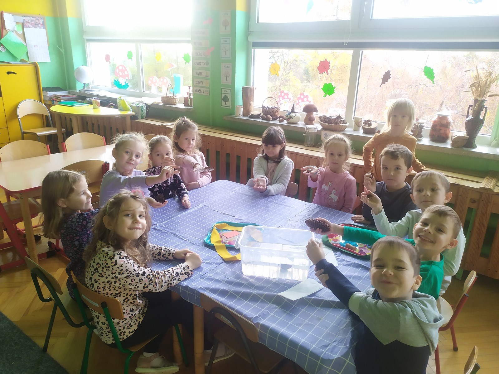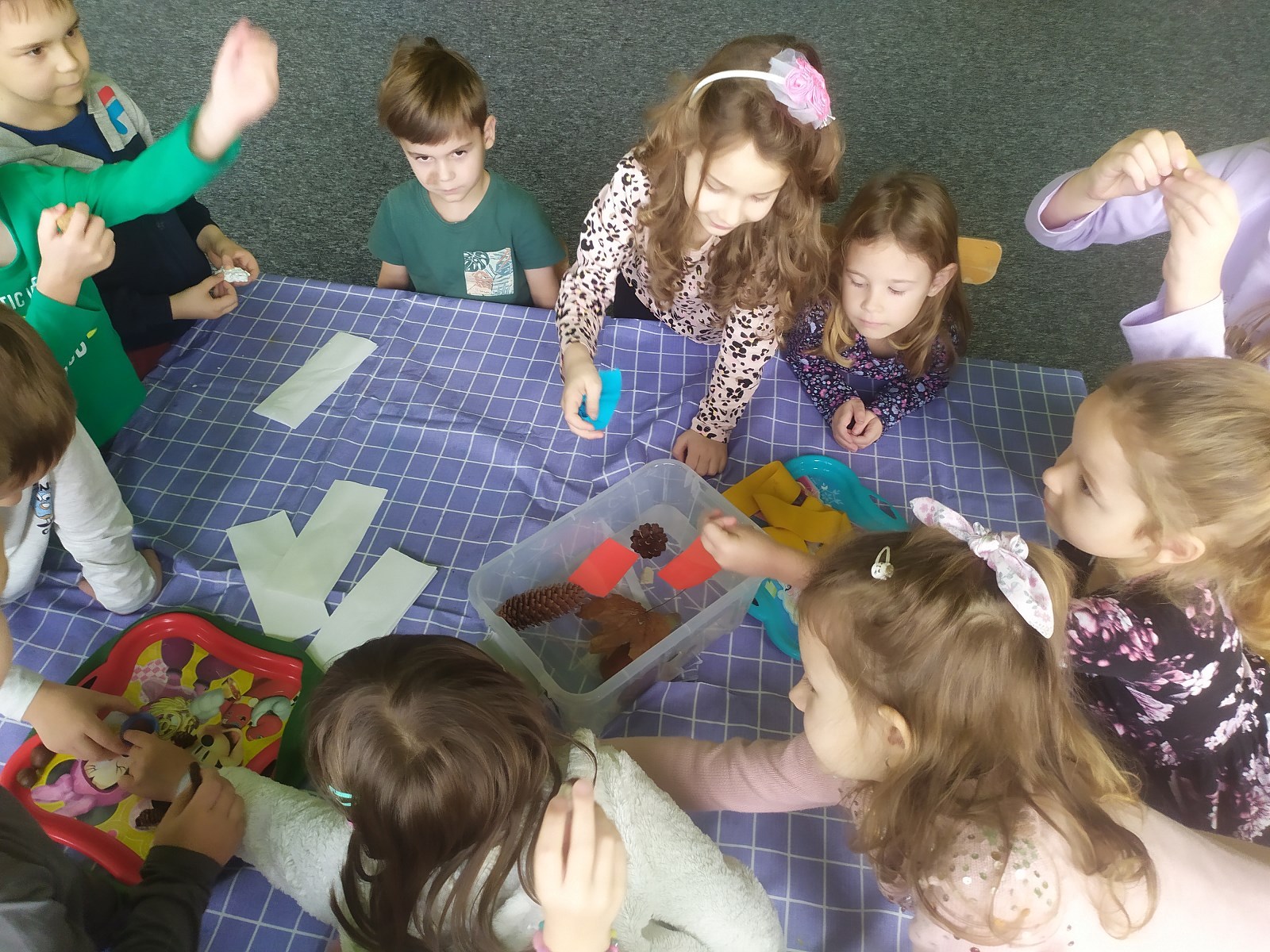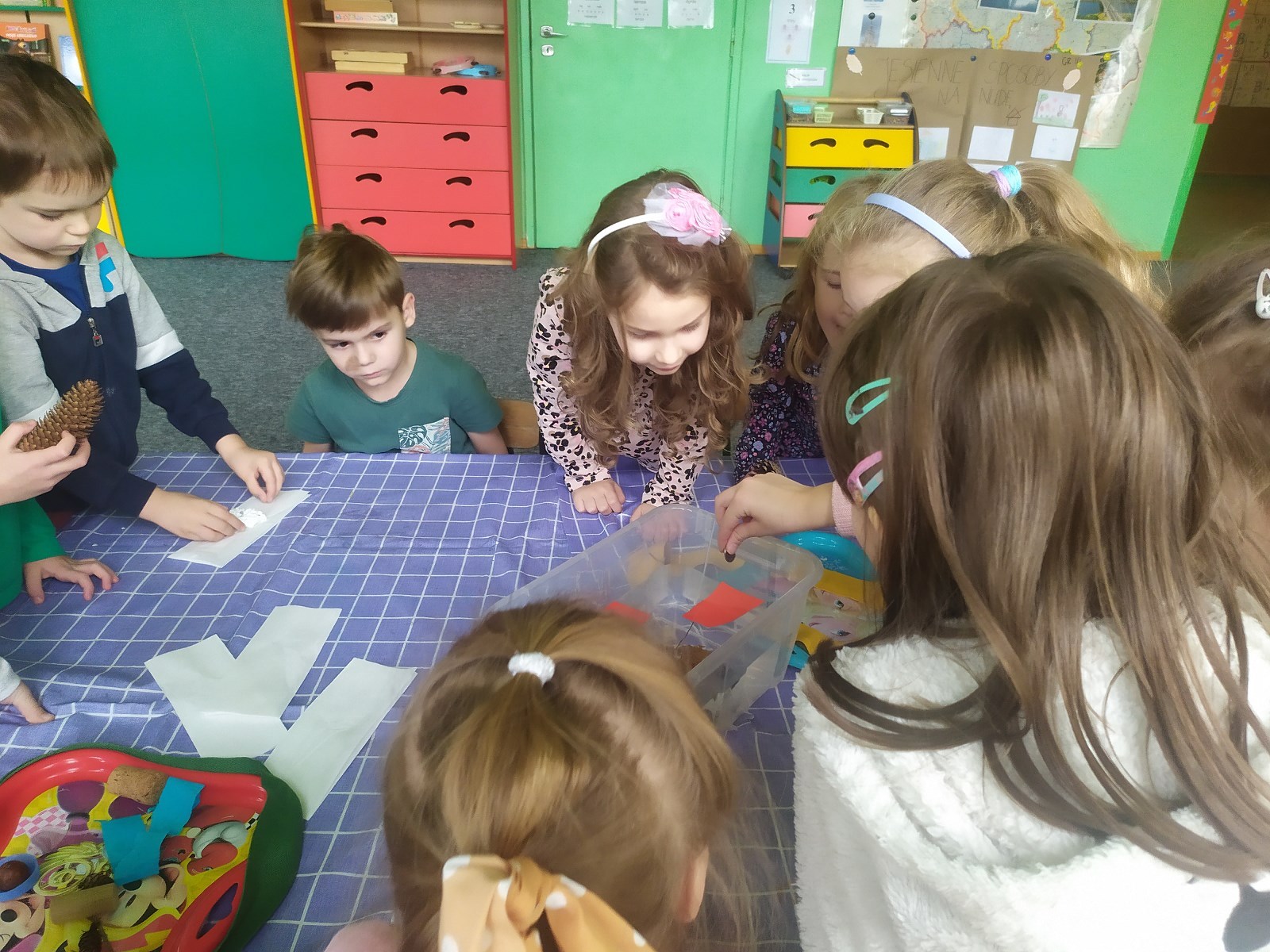 W dniu dzisiejszym 16.11.2023 r. (czwartek) grupa III „RYBKI” przeprowadzała eksperymenty (trudne słowo). Dary natury, które były zebrane przez dzieci i ich rodziców – dziękujemy za zaangażowanie. Szyszki duże i małe, korki od butelek, kasztany, żołędzie, plastelina, kolorowa bibuła, kora, monety, papier, kamienie, listki…i wiele innych. Sprawdzaliśmy co pływa, co nie pływa? Utworzyliśmy dwa zbiory. Pierwszy zbiór – pływające, drugi zbiór te które nie powinny pływać. Wielkie było zdziwienie dzieci gdy coś z pozoru nie pływającego – unosiło się na wodzie. W naszych zbiorach `zrobiliśmy małe zmiany.
