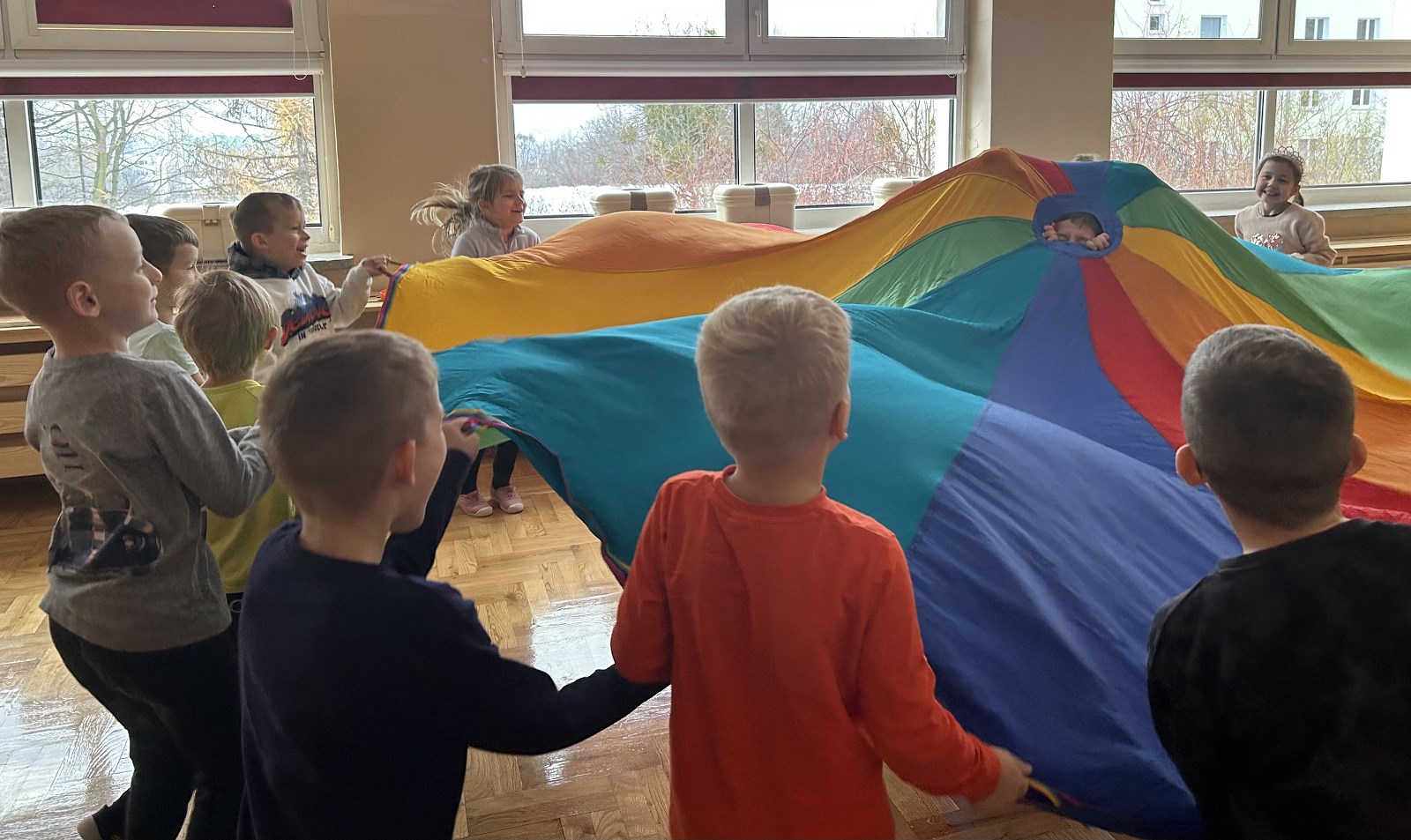 W grupie „Kotki”, w ramach zajęć z wychowania fizycznego, wykorzystujemy chustę animacyjną. Zajęcia te pozwalają dzieciom nie tylko pozytywnie spożytkować energię, ale uczą też komunikacji i interakcji z innymi, a przy tym wspomagają rozwój motoryki i zręczności. Wspólna zabawa sprawia przedszkolakom mnóstwo radości i bardzo integruje grupę.