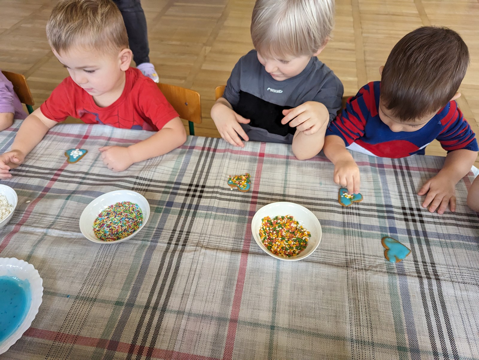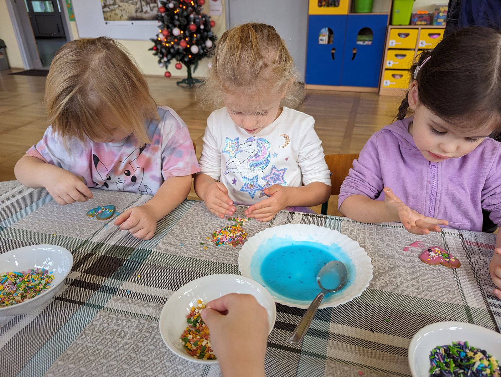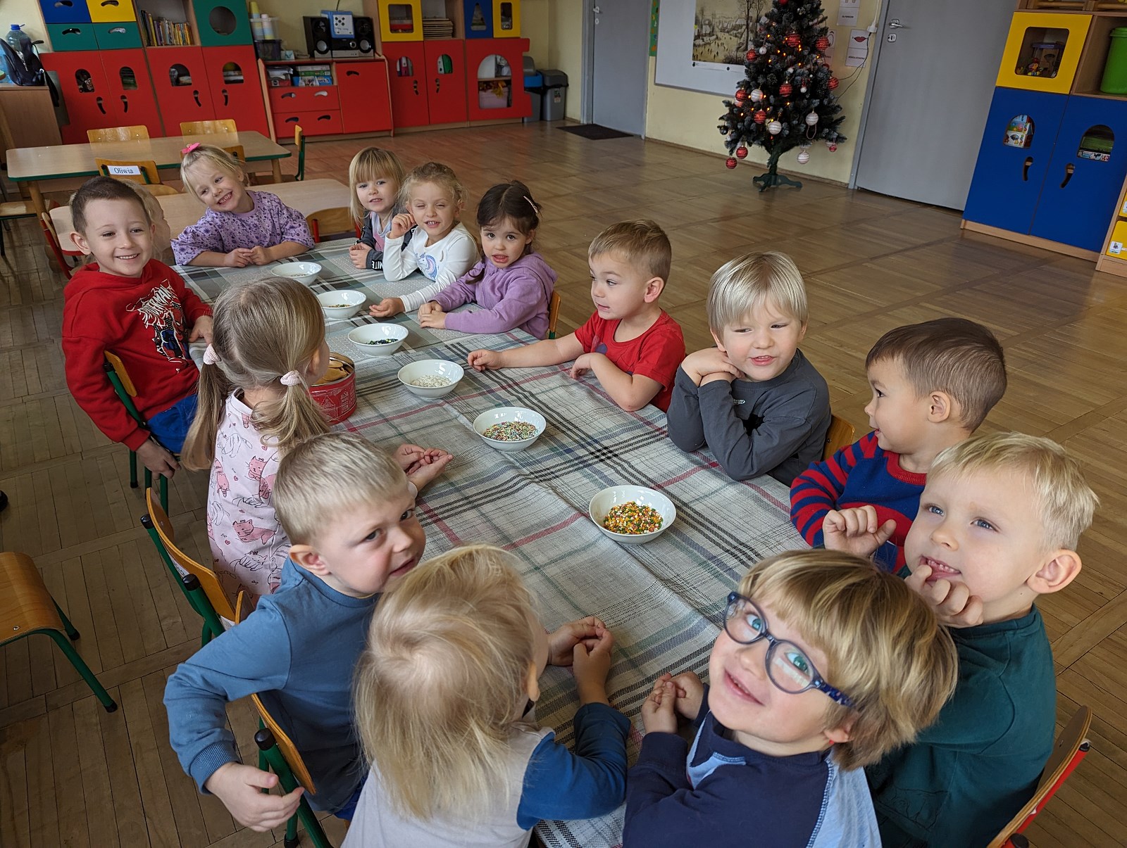 Grupa I „Pszczółki” miała przyjemność własnoręcznie ozdabiać pierniczki przy choince. Świetną zabawą było lukrowanie, a następnie posypywanie pierników kolorowymi ozdobami i posypkami. Na koniec koniecznie należało posprzątać po wykonanej pracy i wylizać dokładnie łyżki od lukru.