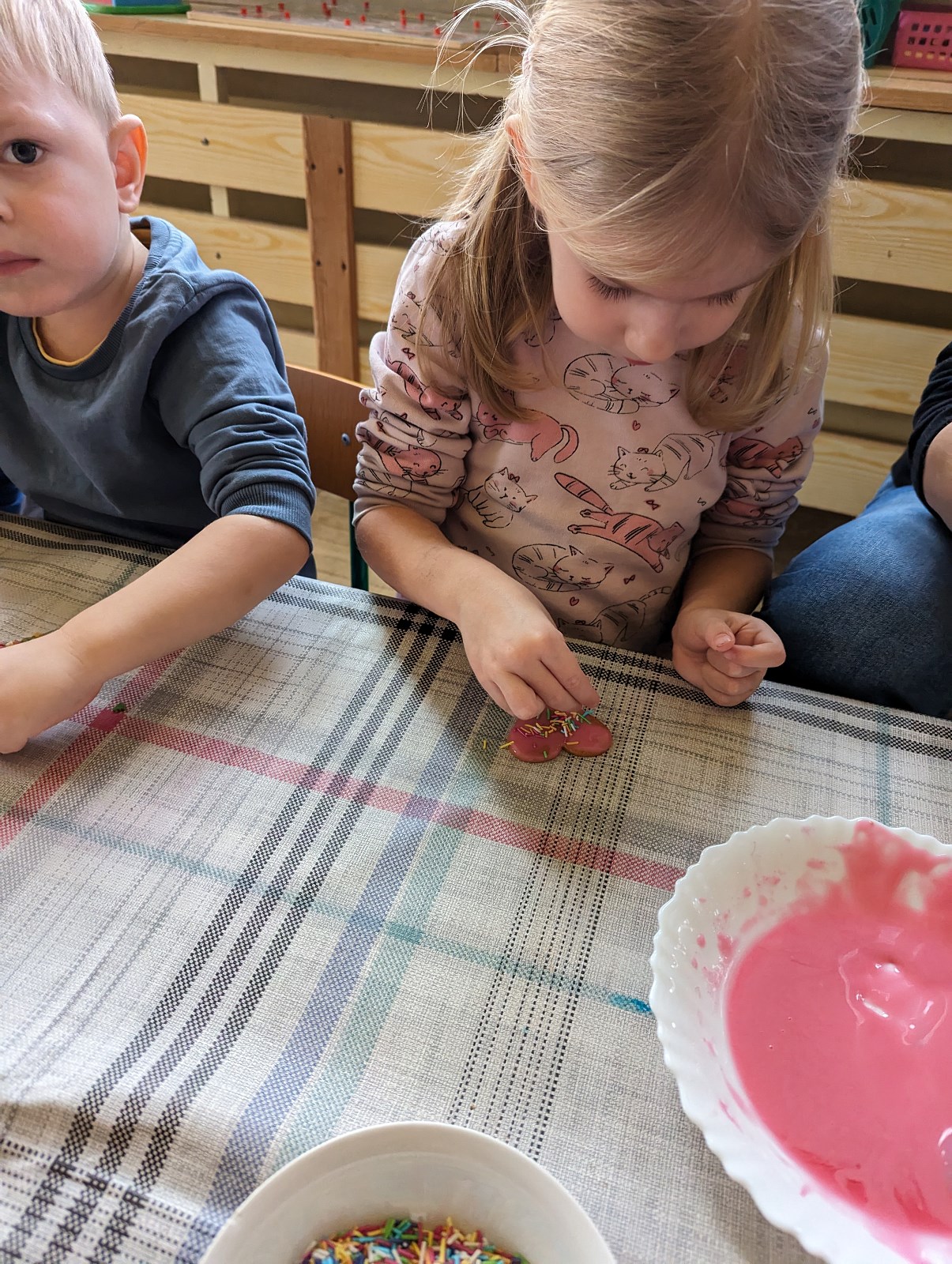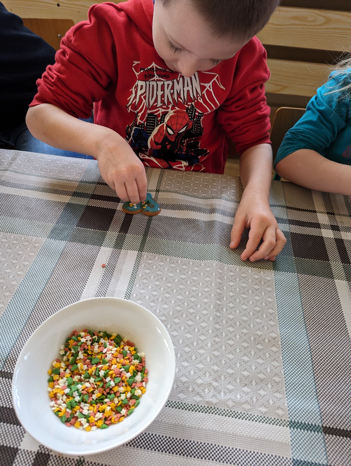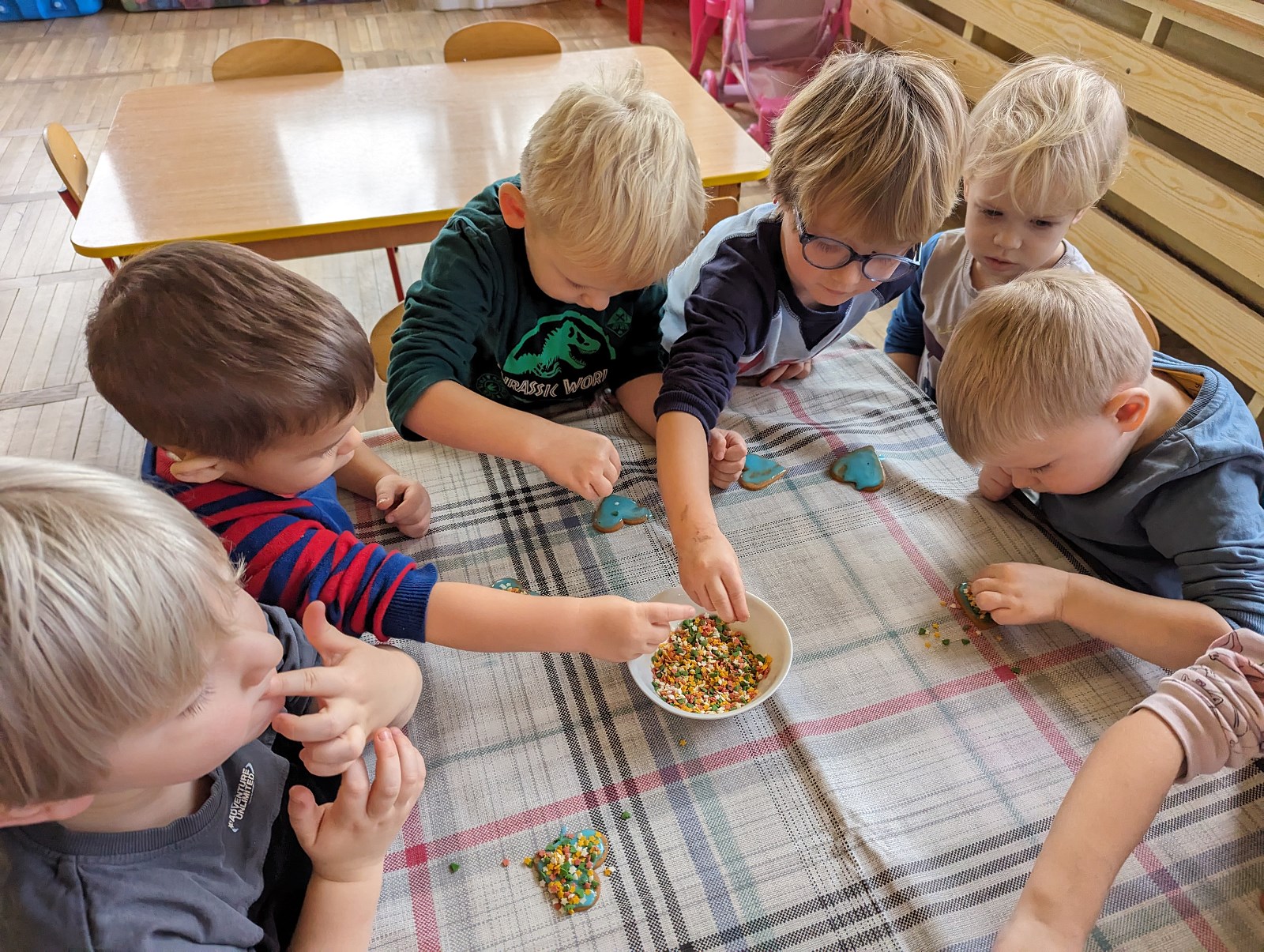 Grupa I „Pszczółki” miała przyjemność własnoręcznie ozdabiać pierniczki przy choince. Świetną zabawą było lukrowanie, a następnie posypywanie pierników kolorowymi ozdobami i posypkami. Na koniec koniecznie należało posprzątać po wykonanej pracy i wylizać dokładnie łyżki od lukru.