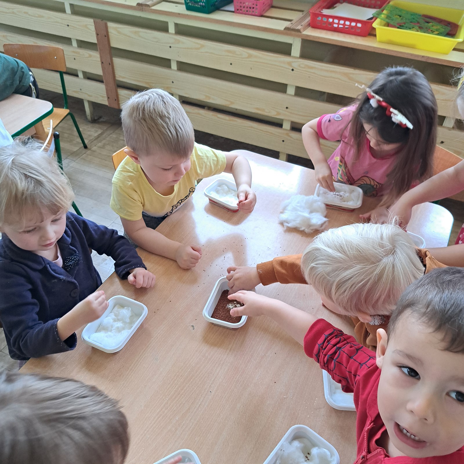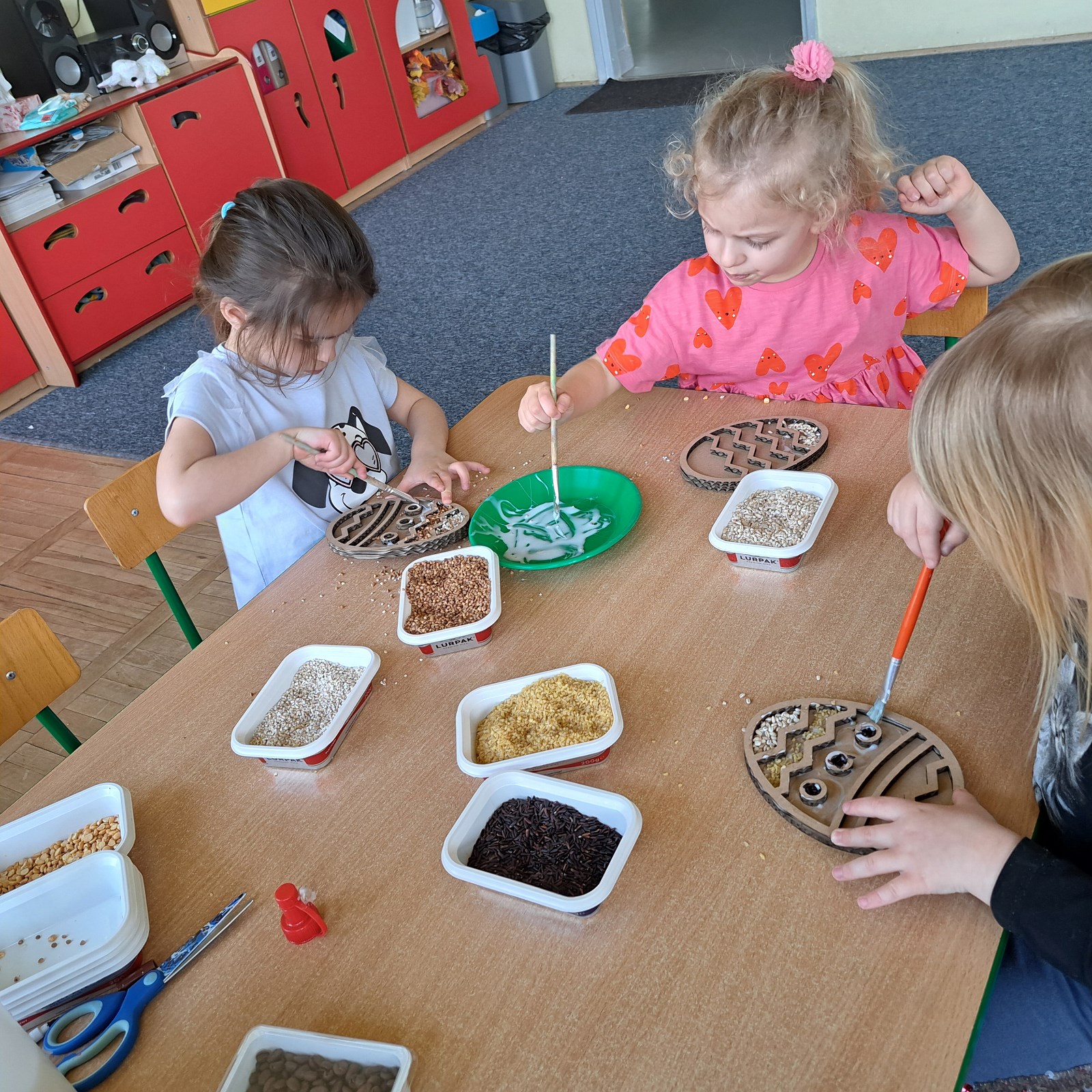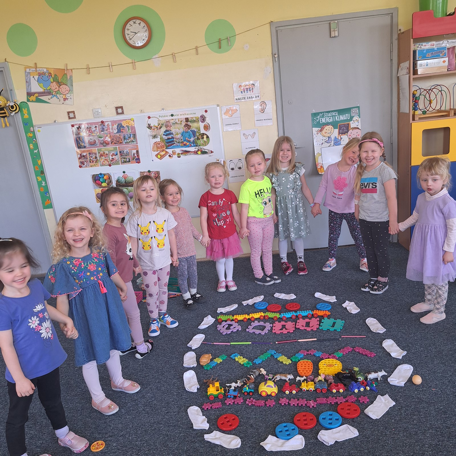 Przygotowania do Wielkanocy 17 kwietnia 2024 Pszczółki podczas przygotowań do wielkanocny siały rzeżuchę, wykonały pisanki sensoryczne oraz przygotowały mega pisanki do których wykorzystały skarpetki i różnego rodzaju klocki i zabawki.