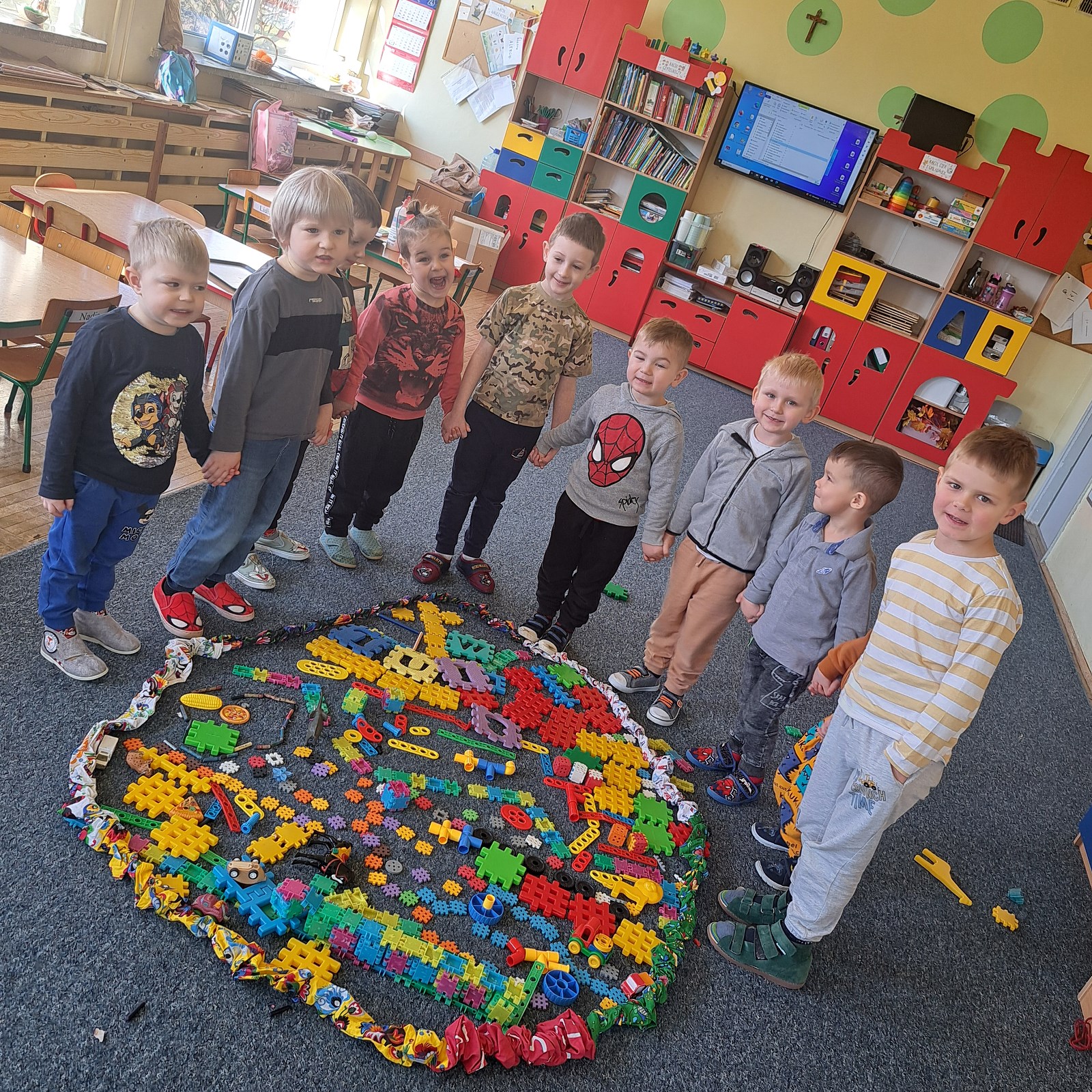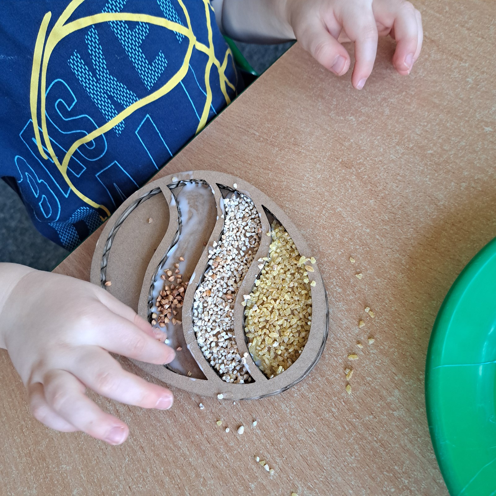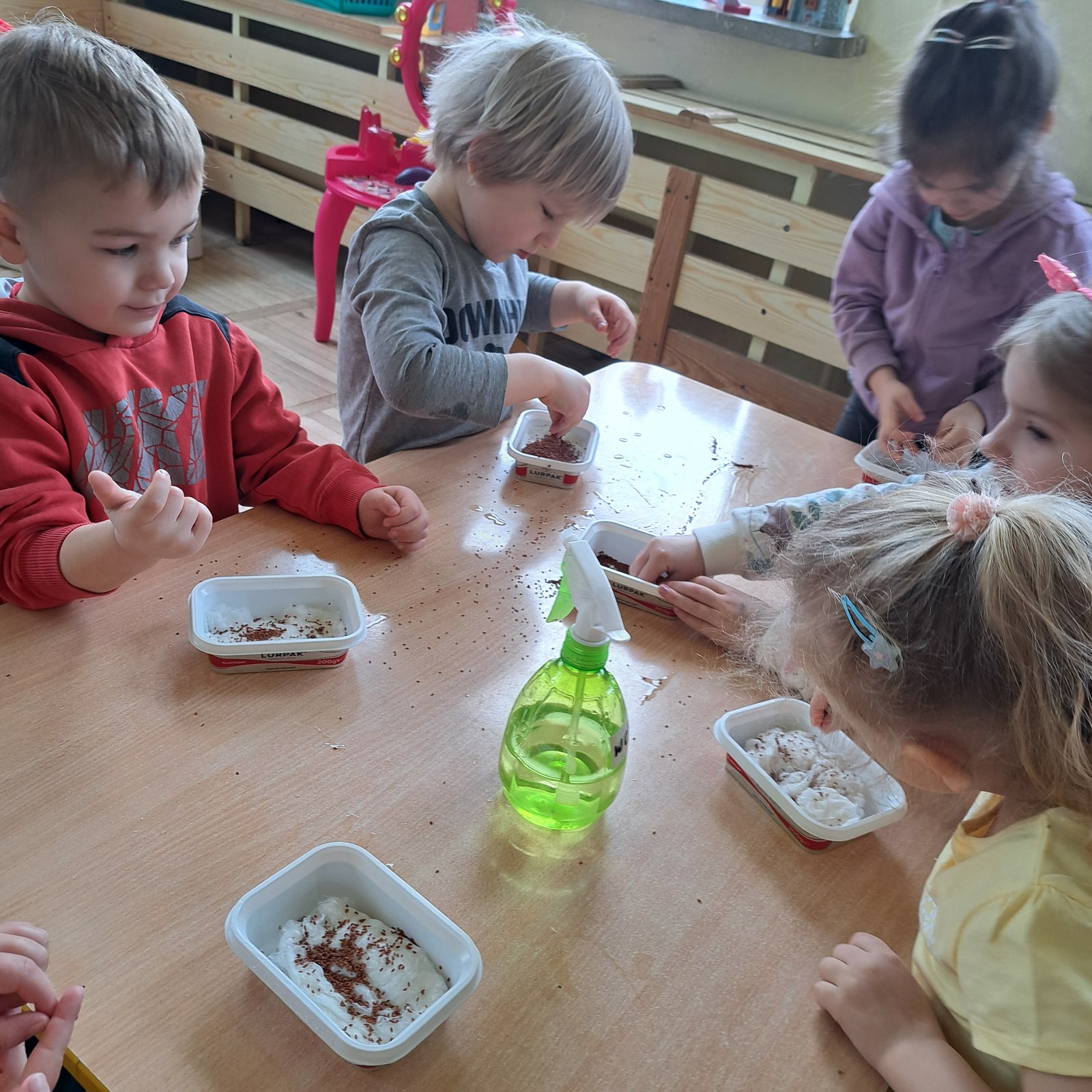 Przygotowania do Wielkanocy 17 kwietnia 2024 Pszczółki podczas przygotowań do wielkanocny siały rzeżuchę, wykonały pisanki sensoryczne oraz przygotowały mega pisanki do których wykorzystały skarpetki i różnego rodzaju klocki i zabawki.
